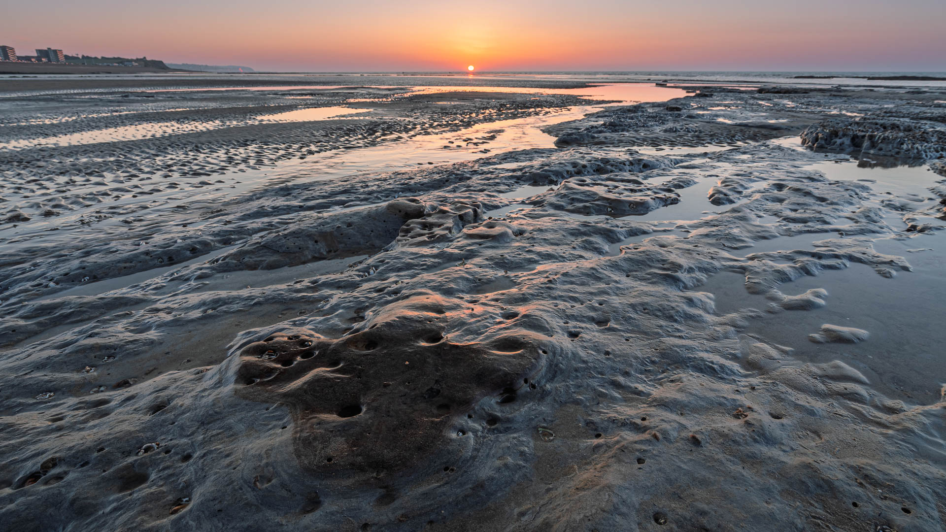 A dinosaur footprint preserved in the sandstone rock platform on Bexhill Beach, East Sussex. The three-toed track dates to the Early Cretaceous period around 135 million years ago when this part of Sussex was a warm river floodplain rather than coastline. The footprint was formed when a dinosaur stepped into soft mud which later hardened and turned into rock. Coastal erosion has now exposed this ancient track surface along the Bexhill foreshore.