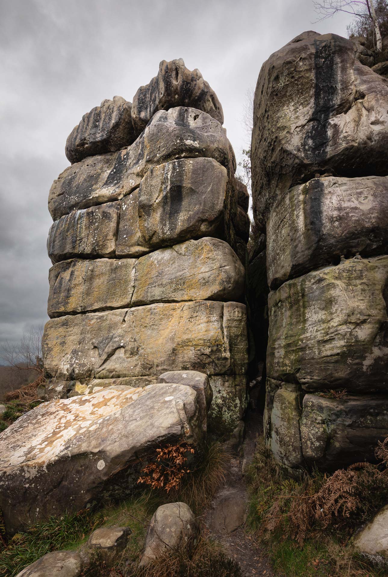 Sandstone formations at Harrison’s Rocks near Groombridge on the Kent–East Sussex border. Part of the Tunbridge Wells Sand Formation in the High Weald, these weathered Cretaceous sandstone cliffs form a long natural ridge through woodland and are a well-known climbing area as well as an important geological feature of the landscape.