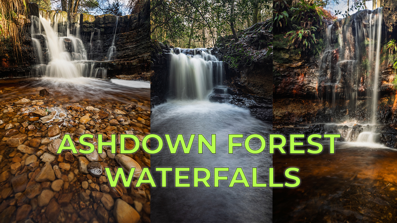 A composite header image showing three hidden waterfalls in Ashdown Forest captured after heavy December rain. These episodic woodland waterfalls only flow for short periods, shaped by sandstone ledges, clay-bound soils, and fast surface runoff. The image introduces a winter nature walk and photography exploration of Ashdown Forest’s temporary waterfalls.