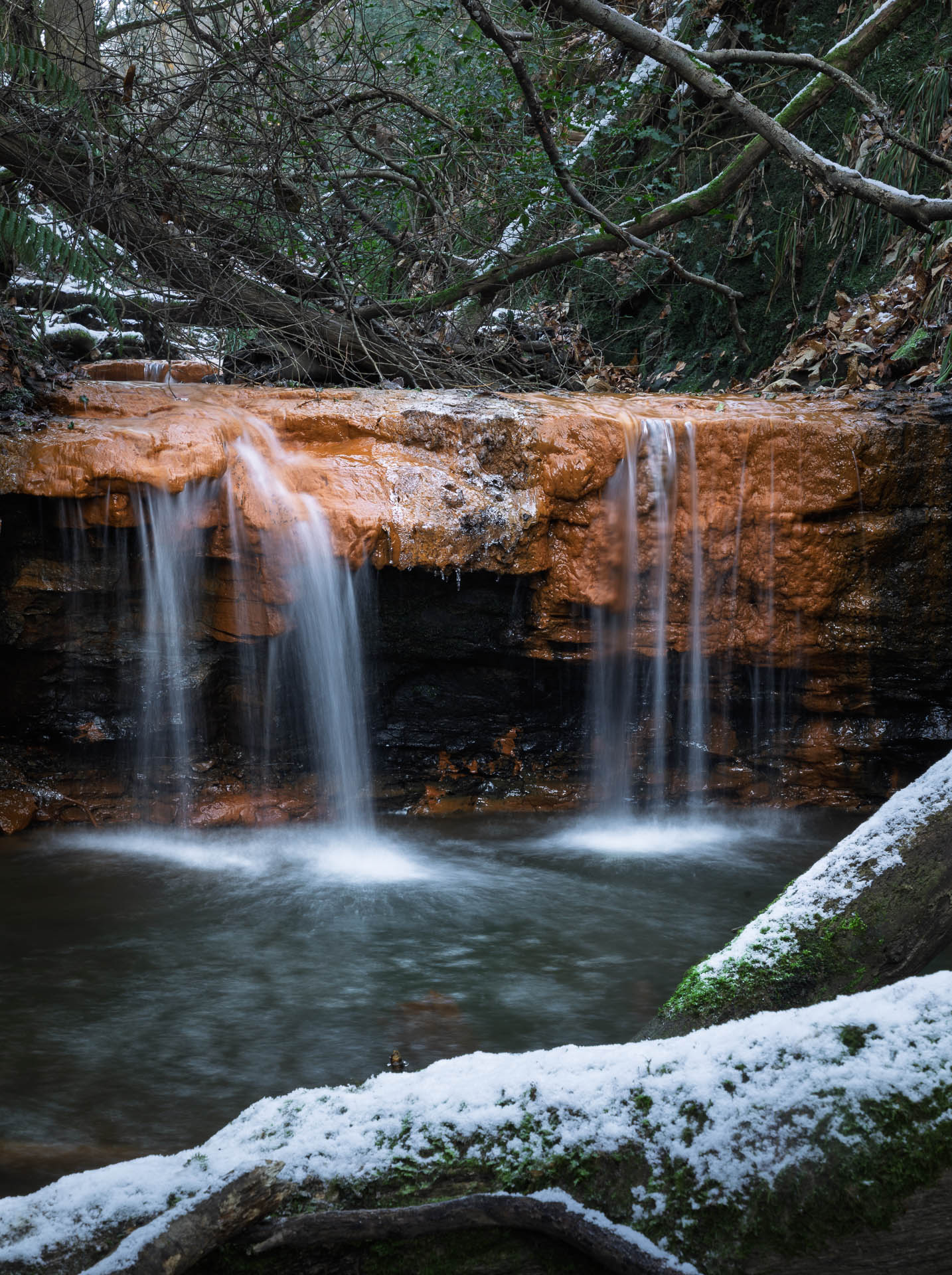 A rarely seen woodland waterfall hidden deep within a narrow ravine in the Marline Valley near Hastings. The rust-coloured sandstone is naturally stained by iron-rich water, contrasting with darker High Weald sandstone and creating a striking scene in winter conditions.