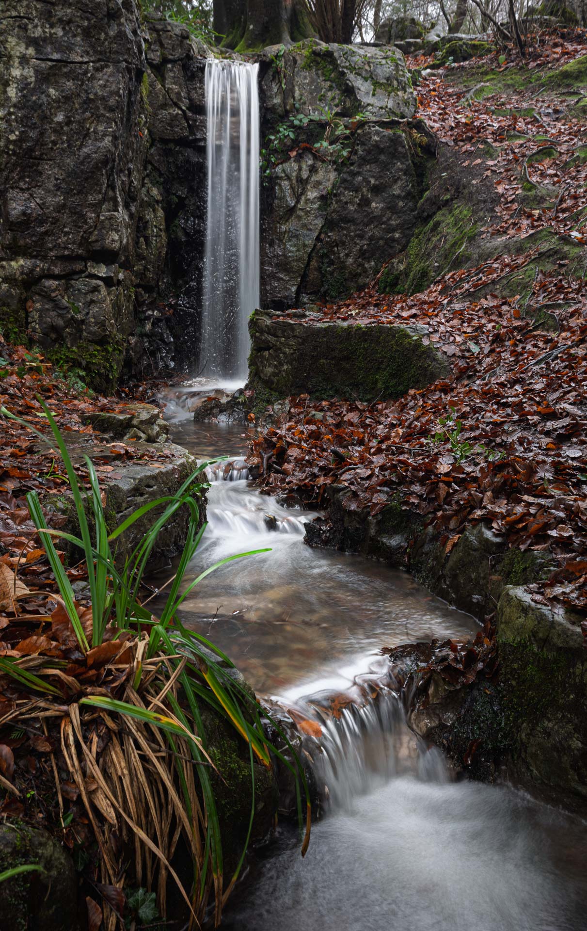 The Vachery waterfall in Ashdown Forest — a landscaped cascade formed from imported limestone, fed by a natural woodland stream and originally part of a private estate garden.