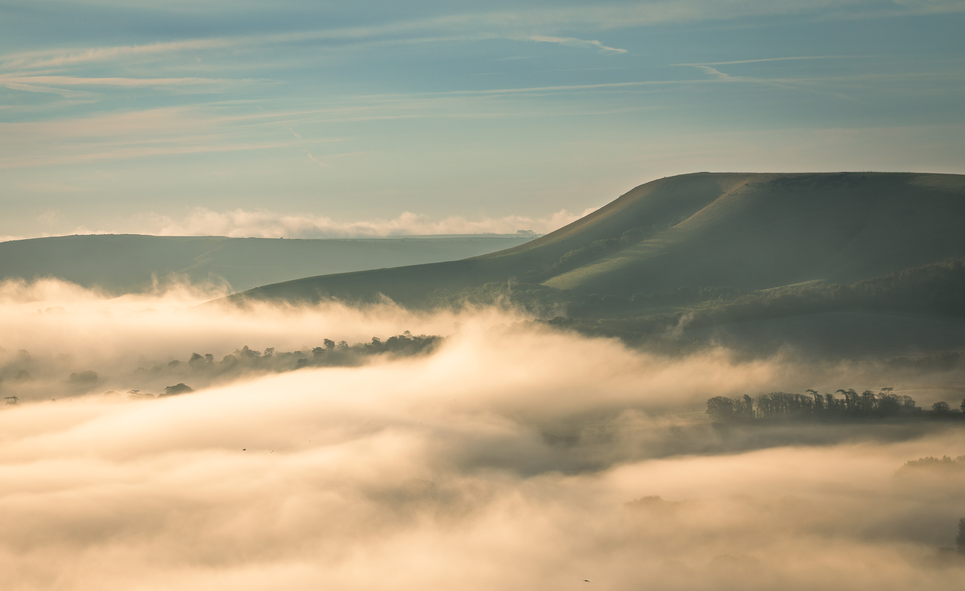Misty September morning from the view east from the top of Mount Caburn on the Lewes Downs east Sussex south east England UK