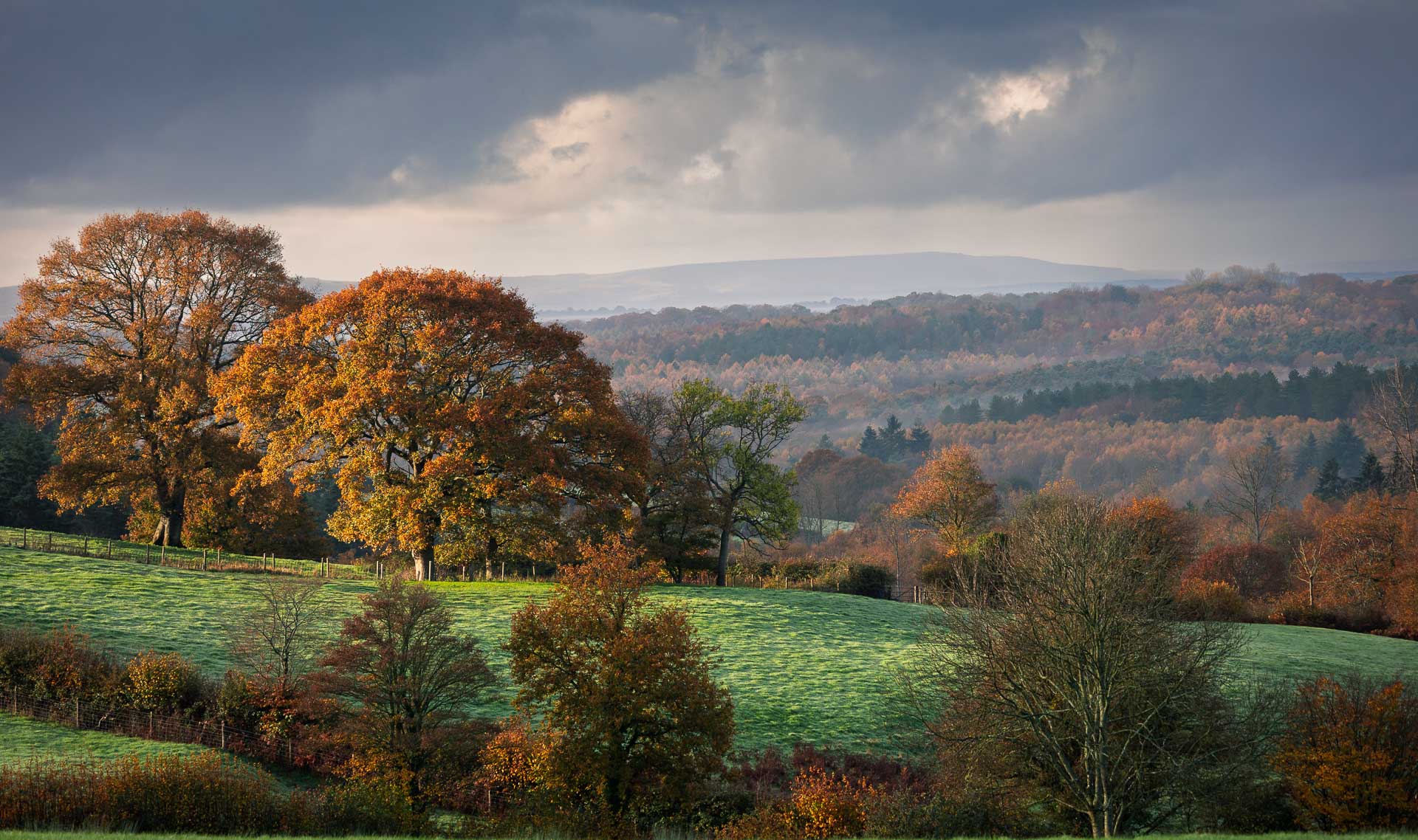 A wide autumn landscape photographed from Penhurst Lane on the High Weald. Morning light breaks through the cloud and highlights oak trees in the foreground, while layers of woodland stretch into the distance towards the South Downs and Butts Brow. One of the classic long-range views of the High Weald in November.