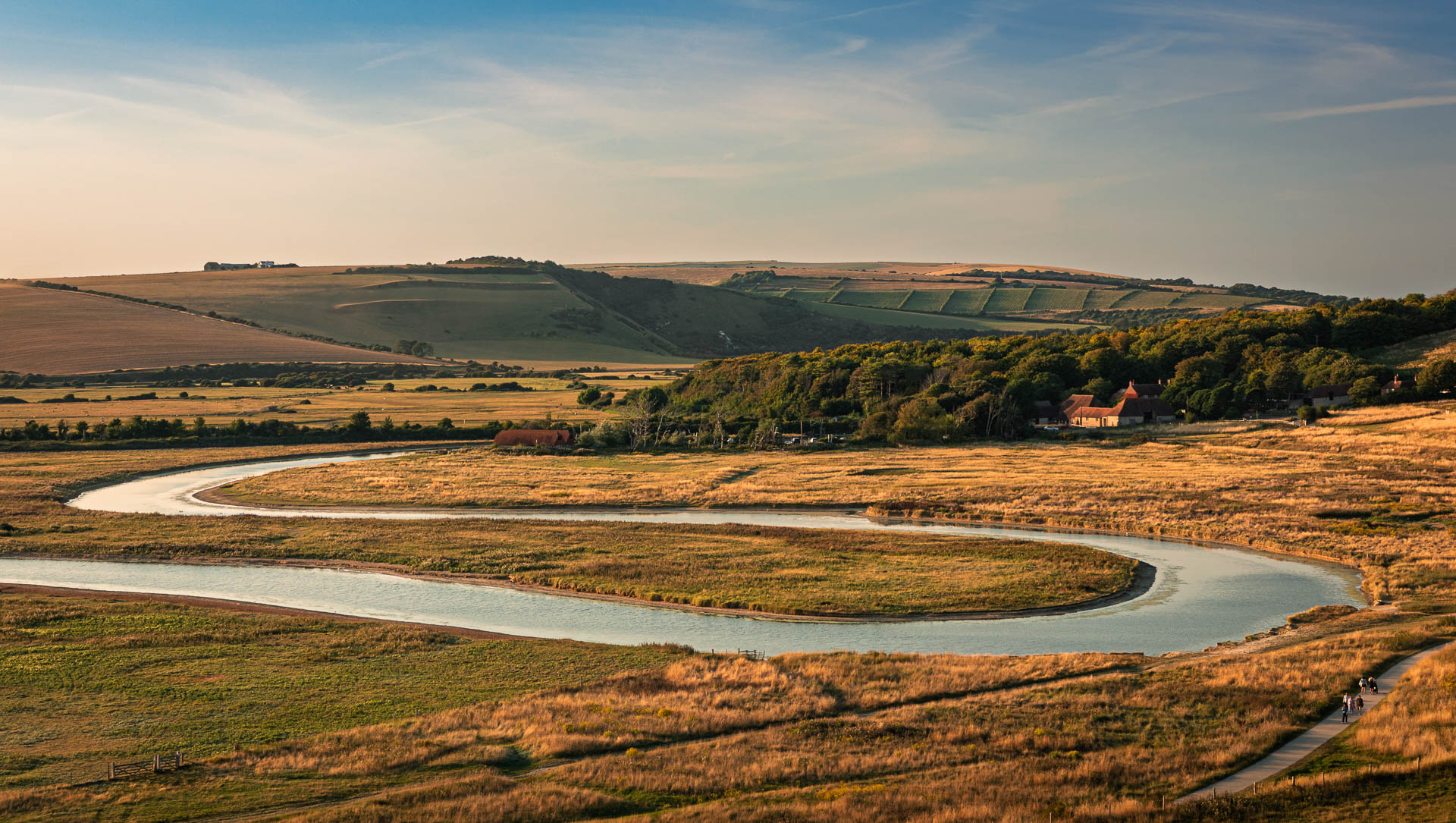 The Cuckmere River meanders across the floodplain below Exceat Hill, its curves catching the warm light of golden hour. From this vantage point the valley opens wide, with the wooded slopes and farmland of the South Downs rising on either side. The scene looks timeless, the same river route that once served the port at Cuckmere Haven and linked the lost village of Exceat to the sea.