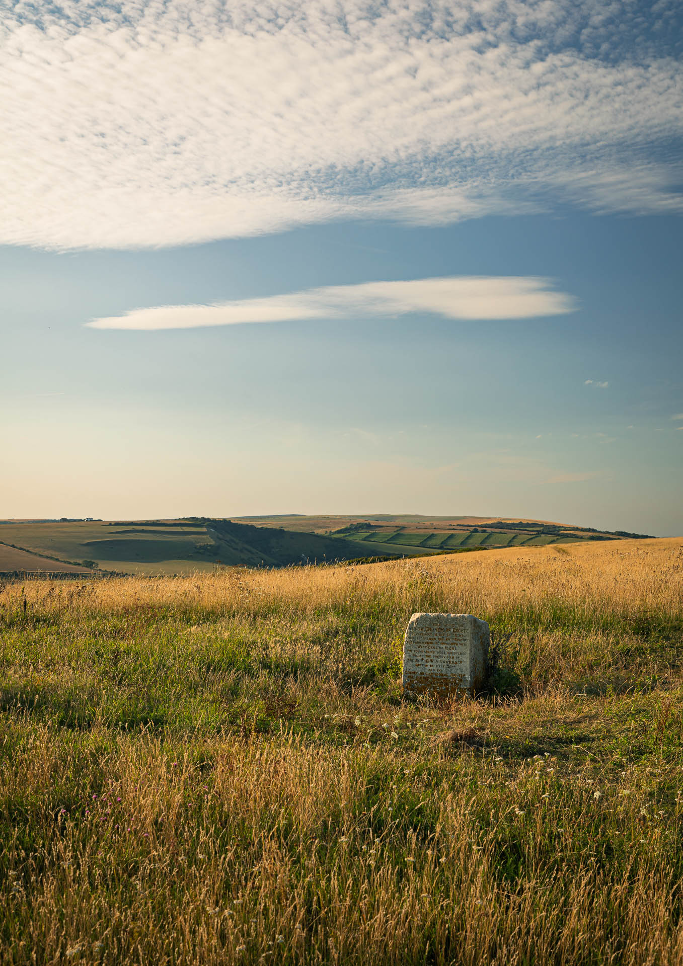 The memorial stone on Exceat Hill stands alone among the grasses of the South Downs, marking the site of the vanished medieval village of Exceat. Once home to a small church and community recorded in the Domesday Book, the village was abandoned in the fifteenth century after famine, plague, and raids left it deserted. The stone was set here in 1913 following an excavation, and today it serves as the only visible reminder of a settlement lost to history, overlooking the Cuckmere Valley and the sea beyond.