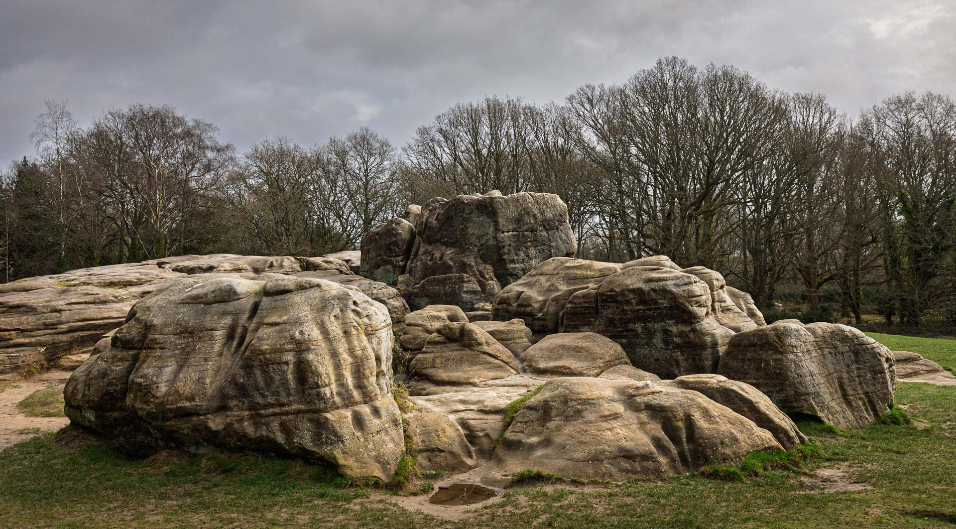 Sandstone outcrops on Tunbridge Wells Common, known as Wellington Rocks, part of the Tunbridge Wells Sand Formation in the High Weald. These weathered iron-rich rocks rise from open heathland just above the historic spa town of Royal Tunbridge Wells, Kent.
